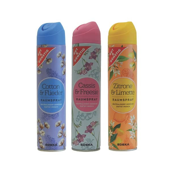 Gut und Günstig Duftspray 3589164000, Zitrone & Limette, 300ml Sprühdose | Gut und Günstig Duftspray 3588938000, Cass & Free, 300ml Sprühdose | Airwick Duftspray 2899555003, Pure Kirschblütenzauber, Kirschblüten-Duft, 250ml Sprüflasche | Airwick Duftspray 2899574004, Pure Frühlingsfrische, Frühlingsfrischer Duft, 250ml Sprühflasche |
