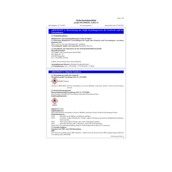 H222 Extrem entzündbares Aerosol. H229 Behälter steht unter Druck: Kann bei Erwärmung bersten.
