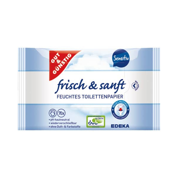 Gut und Günstig Toilettenpapier feucht, frisch & sanft 4192668000, 1-lagig, weiß, 70 Blatt / Packung,