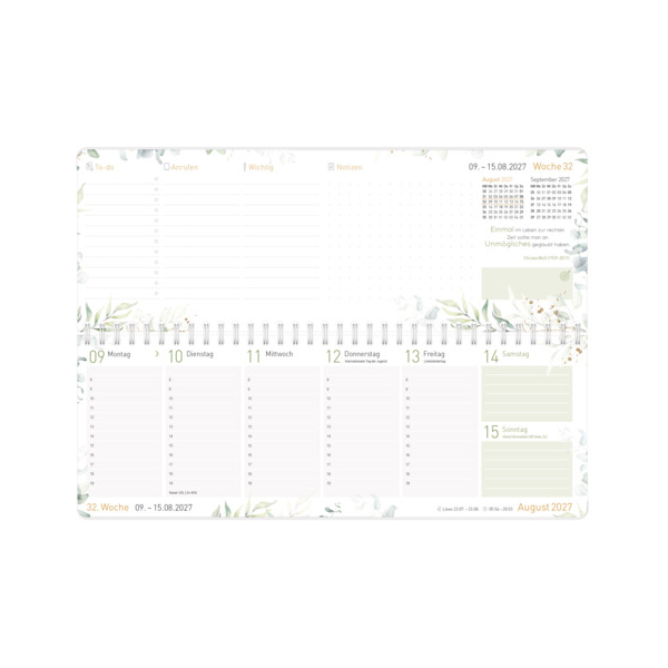 Der Tischkalender Blattgold 2027 im Format 29,7 × 11 cm begleitet durch das gesamte Jahr von Januar bis Dezember 2027. Mit viel Liebe zum Detail gestaltet, zeigt die Vorderseite stets die aktuelle Woche, während die Rückseite großzügigen Platz für Notizen und Wichtiges bietet. Der Kalender enthält zahlreiche Zusatzinfos sowie nachdenkliche und humorvolle Sprüche, die jeden Wochenstart bereichern. Mit 128 Seiten, einer stabilen Wire-O-Bindung und abgerundeten Ecken ist er hochwertig verarbeitet und kann bequem aufgestellt werden – ideal für Schreibtisch, Büro oder Zuhause.