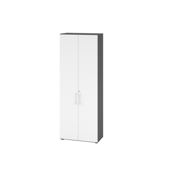 • Frontfarbe: weiß • Korpusfarbe: graphit • Material: Spanplatten, folienummantelt • Flügeltüren • abschließbar (Zylinderschloss)