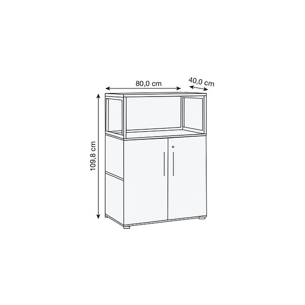 2 Fachböden nicht verstellbar, 28kgTragkraft/Fach, 1 Regal oben mit offenem Rahmenelement aus Stahl, 2 Fächer mit Flügeltüren abschließbar, Sockelfüße verstellbar, Bügelgriff, werkzeuglose Korpusmontage und einfache Demontage durch Klicksystem