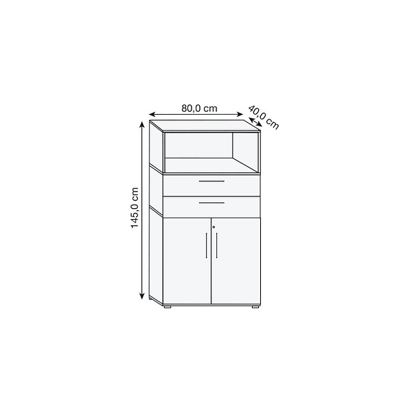 1 Fachboden nicht höhenverstellbar, 28kg Tragkraft/Fachboden,1 Regalfach, 2 Schubladen mit Soft-Stopp, Teilauszug 80%, 2 Fächer mit Flügeltüren abschließbar, Sockelfüße verstellbar, Bügelgriff, zerlegt, werkzeuglose Korpusmontage und einfache Demontage durch Klicksystem