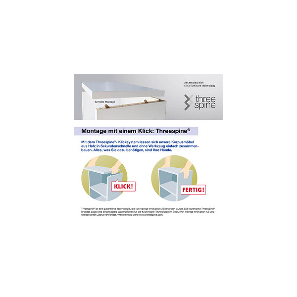 1 Fachboden nicht höhenverstellbar, 28kg Tragkraft/Fachboden,1 Regalfach, 2 Schubladen mit Soft-Stopp, Teilauszug 80%, 2 Fächer mit Flügeltüren abschließbar, Sockelfüße verstellbar, Bügelgriff, zerlegt, werkzeuglose Korpusmontage und einfache Demontage durch Klicksystem