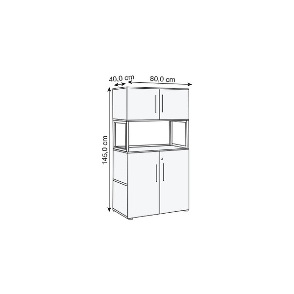 3 Fachböden nicht höhenverstellbar, 28kg Tragkraft/Fachboden, 1 Regalteil, 2 Flügeltüren abschließbar, Sockelfüße verstellbar, Bügelgriff, zerlegt, werkzeuglose Korpusmontage und einfache Demontage durch Klicksystem
