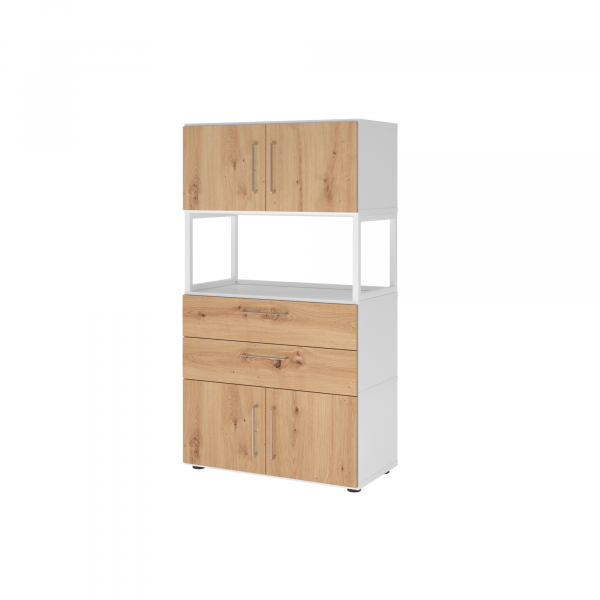 1 Regalfach mit offenem Rahmenelement aus Stahl, 2 Fächer mit je 2 Flügeltüren, 2 Schubladen mit Soft-Stopp, Teilauszug 80%, erhöhte Sockelfüße verstellbar, Bügelgriff, zerlegt, werkzeuglose Korpusmontage und einfache Demontage durch Klicksystem