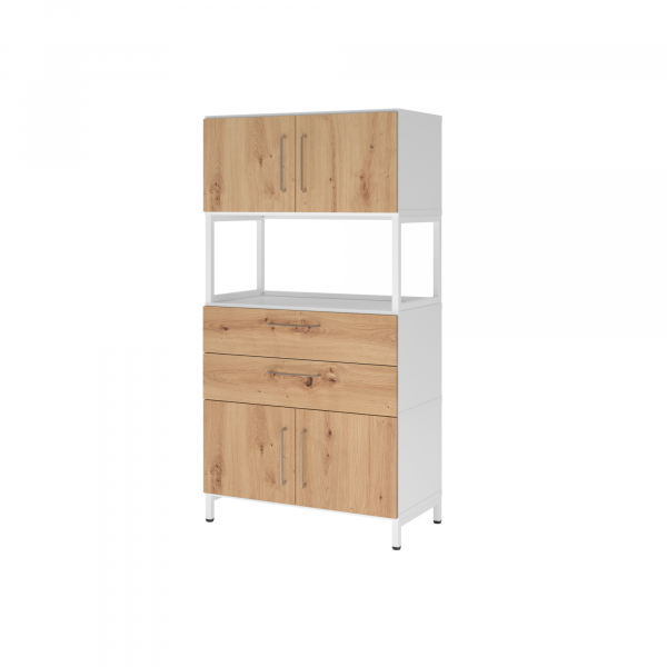 • Ausführung: 1 Regalfach mit offenem Rahmenelement aus Stahl, 2 Fächer mit je 2 Flügeltüren, 2 Schubladen mit Soft-Stopp, Teilauszug 80%