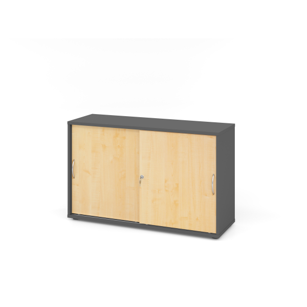 Der Schrank hat die Maße 120 x 40 x 74,8 cm (BxTxH) und bietet genügend Platz für Ihre Unterlagen. Ausgestattet mit zwei Schiebetüren und einer praktischen Mittelseite, ermöglicht er einen einfachen Zugriff auf Ihre Schätze. Zudem ist der Schrank abschließbar und mit einem Druckzylinderschloss versehen, um Ihre Dokumente optimal zu schützen.