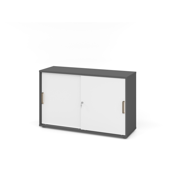 Entdecken Sie den eleganten und praktischen Schiebetürenschrank V1752/V1753 von Hammerbacher. Dieser abschließbare Schrank vereint modernes Design mit durchdachter Funktionalität. Der Korpus in Graphit und die Front in strahlendem Weiß fügen sich harmonisch in jede Büro- oder Wohnumgebung ein. Mit seinen kompakten Abmessungen von 120 x 40 x 74,8 cm (BxTxH) bietet er ausreichend Stauraum, während die zwei Schiebetüren einen einfachen Zugang zu Ihren Unterlagen ermöglichen.