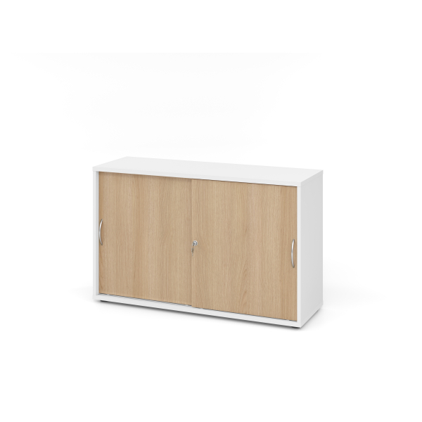 Der Schiebetürenschrank misst 120 x 40 x 74,8 cm (BxTxH) und ist mit zwei Schiebetüren ausgestattet, die Platz sparen und einen einfachen Zugang zu Ihren Unterlagen ermöglichen. Dank des integrierten Druckzylinderschlosses ist der Schrank abschließbar, sodass Ihre Dokumente und persönlichen Gegenstände stets sicher aufbewahrt sind.
