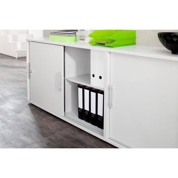 Der Schiebetürenschrank verfügt über zwei praktische Schiebetüren und eine Mittelseite, die Ihnen den Zugang zu Ihren Unterlagen erleichtern. Zudem ist er mit einem hochwertigen Druckzylinderschloss ausgestattet, wodurch er abschließbar ist und Ihre Dokumente sicher verstaut werden können. Die Chromgriffe aus Metall runden das designtechnische Gesamtbild ab.