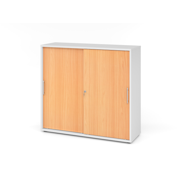 Der Schiebetürenschrank ist in der Größe 120 x 40 x 110 cm (BxTxH) konzipiert und verfügt über zwei Schiebetüren sowie eine Mittelseite. Mit einem integrierten Druckzylinderschloss ist der Schrank abschließbar, was Ihnen zusätzliche Sicherheit für Ihre Unterlagen bietet. Der Relinggriff RE aus Kunststoff sorgt für einfachen Zugriff.