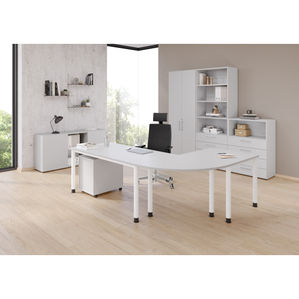Die Tischplatte besteht aus stabiler Holzspanplatte mit einer Dicke von 25 mm und ist mit einer robusten Melaminharzbeschichtung versehen, die für Langlebigkeit sorgt. Das 4-Fuß-Gestell in Weiß bietet eine hohe Stabilität und kann sowohl links als auch rechts montiert werden. Mit einem Gewicht von 38,58 kg ist der Schreibtisch zudem leicht zu bewegen.