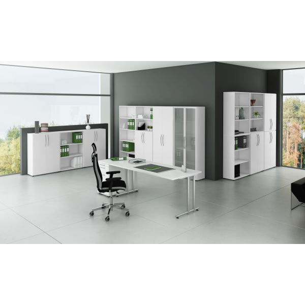 Die Tischplatte besteht aus hochwertiger Spanplatte, die mit einer robusten Melaminharzbeschichtung versehen ist. Diese sorgt nicht nur für eine langlebige Nutzung, sondern verleiht dem Schreibtisch auch eine ansprechende Optik. Das C-Fuß-Gestell in Silber (ähnlich RAL 9006) sorgt für Stabilität und eine moderne Ausstrahlung.