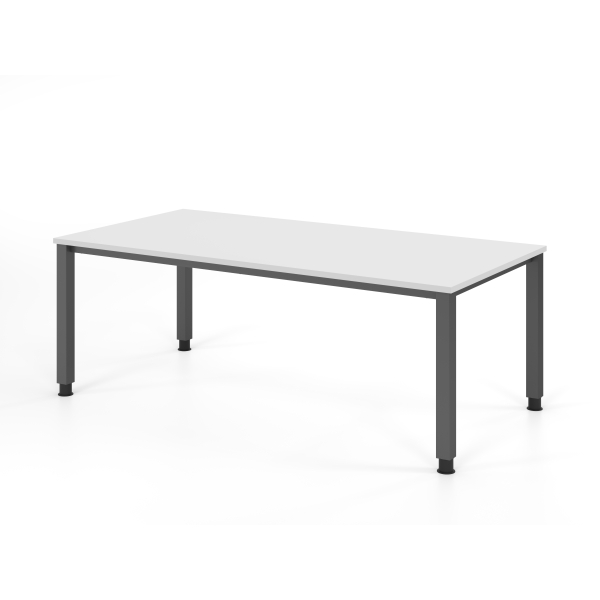 Die Tischplatte in strahlendem Weiß hat eine Stärke von 25 mm und ist mit einer 2 mm dicken ABS-Kante versehen, die für Langlebigkeit sorgt. Das stabile 4-Fuß-Gestell in Graphit (ähnlich RAL 7012) verleiht dem Schreibtisch eine ansprechende Optik und sorgt für einen sicheren Stand.