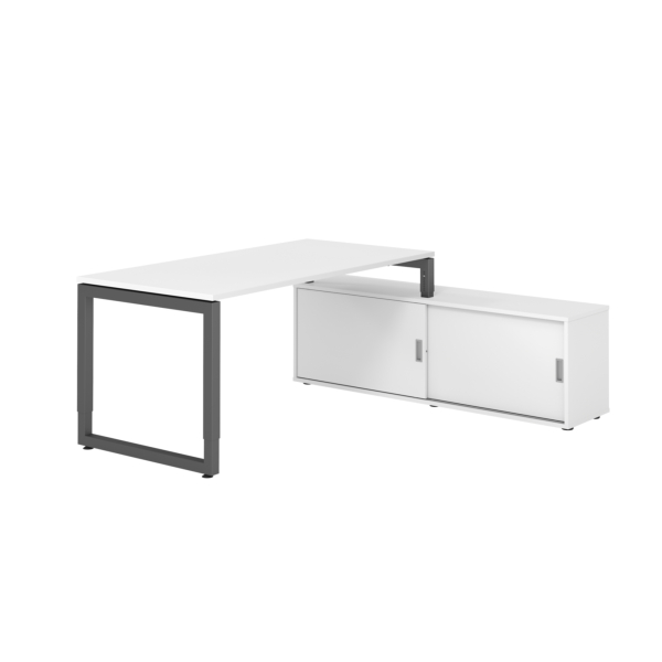 Die Schreibtischkombination beinhaltet ein praktisches Sideboard mit zwei Schiebetüren, das Ihnen zusätzlichen Stauraum bietet. Zudem kann der Tisch mit einer beiliegenden Kufe als separates Einzelmöbel verwendet werden, was Ihnen Flexibilität bei der Gestaltung Ihres Arbeitsbereichs bietet.
