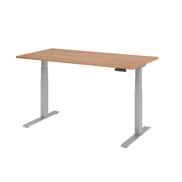 Hammerbacher Sitz-Steh-Schreibtisch Basic, elektrisch höhenverstellbar, 64-129cm (H), 160x80cm (BxT), rechteckig, nussbaum / silber