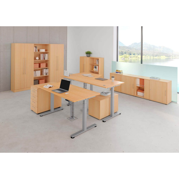 Hammerbacher Sitz-Steh-Schreibtisch VXDSM, elektrisch höhenverstellbar, 63,5-128,5cm (H), 180x100cm (BxT), Trapezform, buche / silber