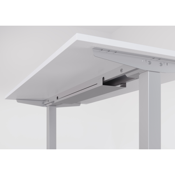 Die trapezförmige Tischplatte in lichtgrau und das graphitfarbene T-Fuß-Gestell sorgen nicht nur für eine moderne Optik, sondern auch für eine hohe Stabilität. Mit der Soft Start/Stopp Funktion, dem Kollisionsschutz und der praktischen Memoryfunktion wird die Nutzung des Schreibtisches zum Kinderspiel.