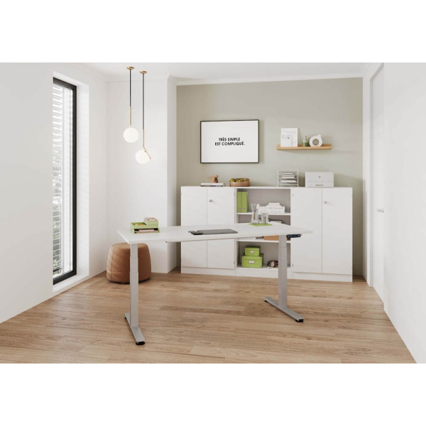 Jetzt Hammerbacher Sitz-Steh-Schreibtisch VXDSM, elektrisch höhenverstellbar, 63,5-128,5cm (H), 180x100cm (BxT), Trapezform, weiß / silber günstig kaufen.