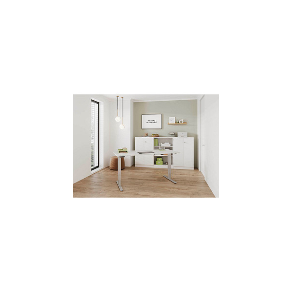 Entdecken Sie den Sitz-Steh-Schreibtisch XDSM von Hammerbacher, der Ihnen die Flexibilität bietet, Ihre Arbeitsposition mühelos zu wechseln. Mit einem eleganten Design in Weiß und Silber fügt sich dieser Schreibtisch harmonisch in jedes Büroambiente ein. Der elektrisch höhenverstellbare Tisch ermöglicht Ihnen eine individuelle Anpassung der Höhe zwischen 63 und 127 cm, sodass Sie sowohl im Sitzen als auch im Stehen komfortabel arbeiten können.