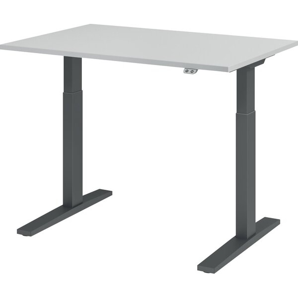 elektrisch höhenverstellbarer Sitz-Steh-Schreibtisch Hammerbacher XMKA VXMKA12/5/G • für ergonomisches Arbeiten • Höhe: 70-120cm • Platte: grau, 120x80cm (BxT), rechteckig, Spanplatte mit Melaminharzbeschichtung, 25mm • Gestell: graphit, C-Fuß-Gestell, Stahl, pulverbeschichtet • ohne Rollen • Tragfähigkeit: bis 100kg • Gewicht: 43,5kg • Anlieferung: zerlegt