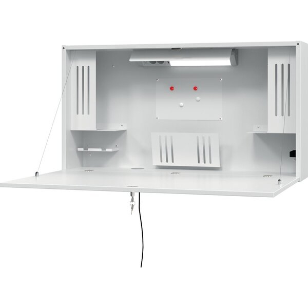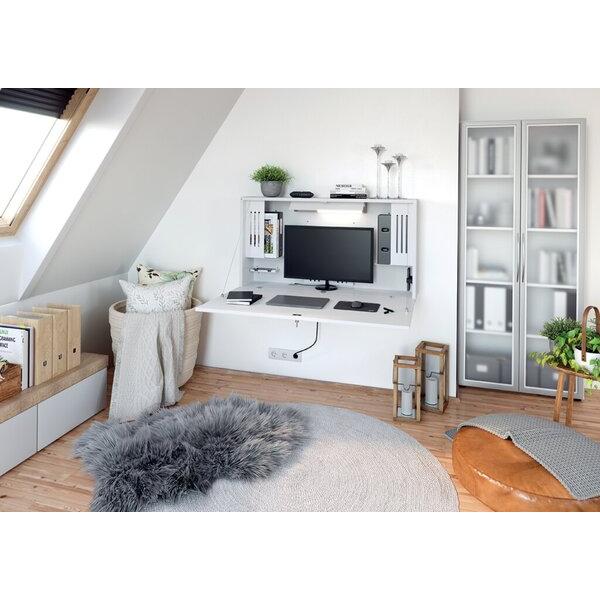 Der Wandschreibtisch überzeugt nicht nur durch sein elegantes Design in Weiß, sondern bietet auch eine Vielzahl an praktischen Funktionen. Die integrierte LED-Leuchte, zwei Steckdosen und zwei USB-Anschlüsse sorgen dafür, dass Sie immer bestens ausgestattet sind. Dank der abschließbaren Ablage bleibt Ihre Ausstattung sicher verstaut.