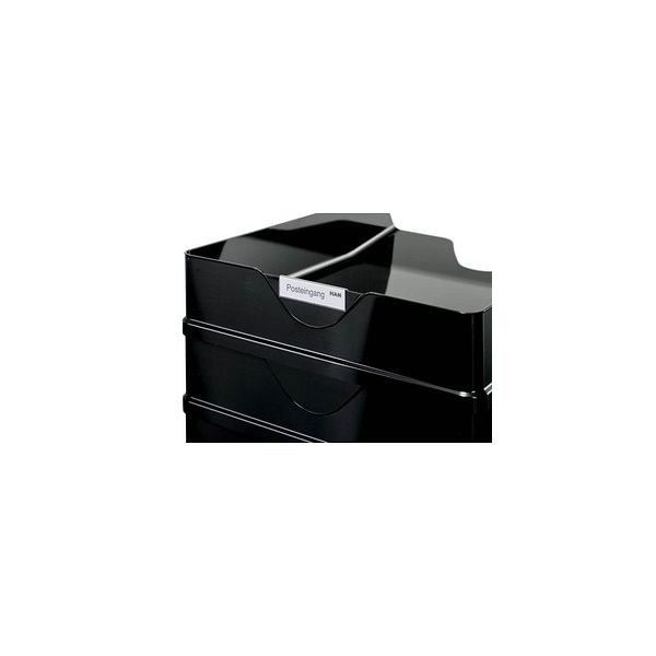 | moderne, hochglänzende, elegante Briefablage inkl. Beschriftungsclip · mehrfach übereinander stapelbar · mit tiefem Greifausschnitt | |