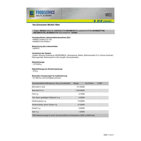 Die Schnecken Minibtl 10g bieten ein einzigartiges Geschmackserlebnis mit einer sorgfältigen Auswahl an Zutaten, darunter brauner Zuckersirup, WEIZENMEHL[?], Glukosesirup, Stärke und natürlichen Aromen. Ihnen wird die hohe Qualität der Haribo-Produkte sofort bewusst.