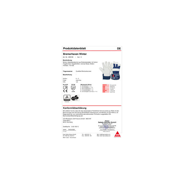 • Handschuhgröße: 11 / XXL • Beschichtung: ohne • Trägermaterial: Rindnarbenleder • Klasse: CAT II • erfüllte Normen: EN 388 3142X, EN 511 11X, EN 420 • Abriebstufe 3 • gefüttert