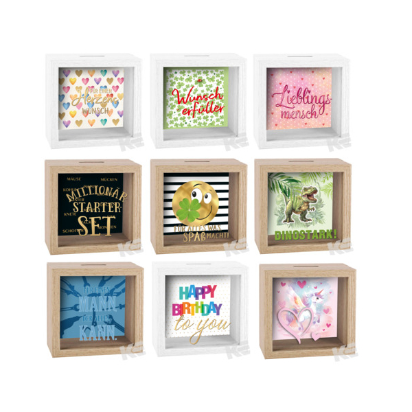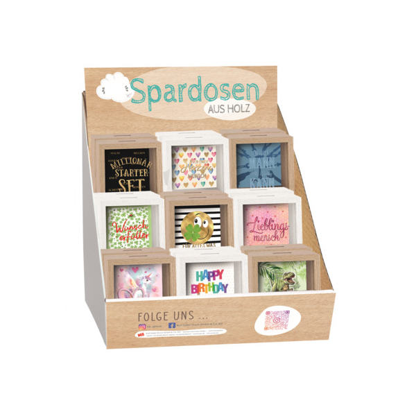 Dieses Display enthält 9 verschiedene Designs à 2 Stück Spardosen aus Holz, wahlweise in weiß oder braun, mit einer eleganten Glasscheibe und einer bedruckten Innenseite. Die Spardosen sind zusätzlich mit einer Folienveredelung versehen und bieten eine stilvolle Möglichkeit, Geld zu sparen. Mit einer Größe von 11x11 cm sind sie nicht nur funktional, sondern auch ein schöner Hingucker. zum Datenblatt