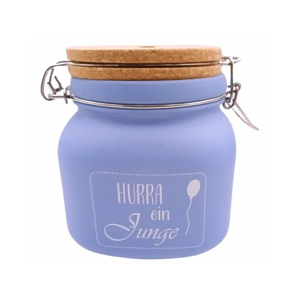 Entdecken Sie die zauberhafte Spardose aus Glas in der kleinen Ausführung von HERGO. Modell 8924, mit dem fröhlichen Motiv "Hurra ein Junge", ist der perfekte Begleiter für die ersten Schritte in die Welt des Sparens.
