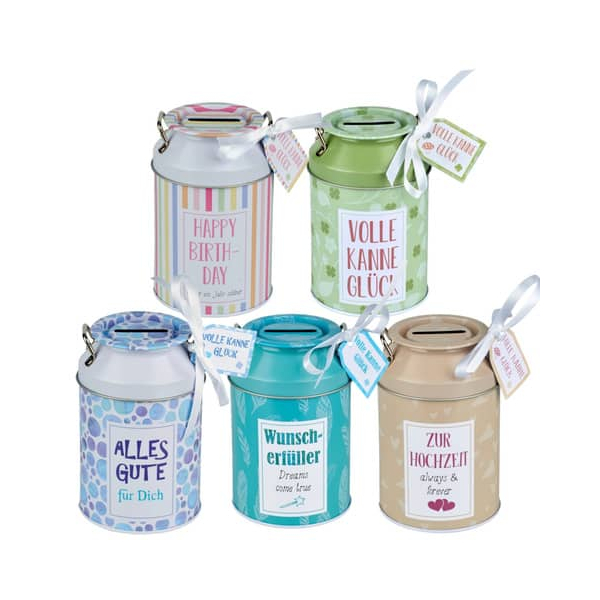 Die Spardose ist in fünf beliebten Motiven erhältlich: "Happy Birthday", "Volle Kanne Glück", "Alles Gute", "Wunscherfüller" und "Zur Hochzeit". Jedes Motiv bringt Freude und Glück in Ihr Zuhause oder das eines Freundes.