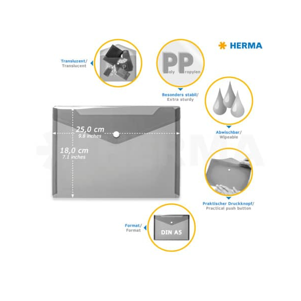 Herma Dokumententasche 20061, A5, transparent violett, Polypropylen (PP), Druckknopf | Herma Dokumententasche 20054, A5, transparent rot, Polypropylen (PP), Druckknopf | Herma Dokumententasche 20060, A5, transparent türkis, Polypropylen (PP), Druckknopf | Herma Dokumententasche 20059, A5, transparent hellblau, Polypropylen (PP), Druckknopf | Herma Dokumententasche 20057, A5, transparent orange, Polypropylen (PP), Druckknopf | Herma Dokumententasche 20052, A5, transparent gelb, Polypropylen (PP), Druckknopf | Herma Dokumententasche 20058, A5, transparent pink, Polypropylen (PP), Druckknopf | Herma Dokumententasche 20053, A5, transparent dunkelgrün, Polypropylen (PP), Druckknopf | Herma Dokumententasche 20051, A5, transparent weiß, Polypropylen (PP), Druckknopf | Herma Dokumententasche 20056, A5, transparent orange/pink/hellblau/türkis und violett, Polypropylen (PP), Druckknopf |
