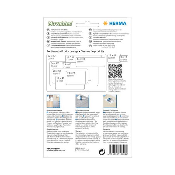 Entdecken Sie die vielseitigen Etiketten Movables 10609 von Herma. Diese selbstklebenden Etiketten sind ideal für alle, die ein flexibles Beschriften, Adressieren und Kennzeichnen wünschen. Mit ihren Abmessungen von 19x40mm und der rechteckigen Form bieten sie Ihnen eine optimale Lösung für zeitlich befristete oder wechselnde Kennzeichnungen.