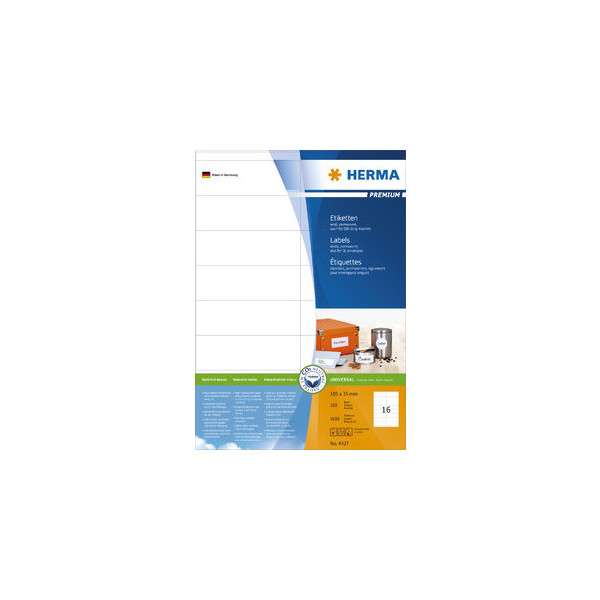 Entdecken Sie die HERMA Etiketten Premium 4427: Selbstklebende Universaletiketten in der praktischen Größe von 105x35mm, rechteckig und ideal für Ihre individuellen Beschriftungsbedürfnisse.