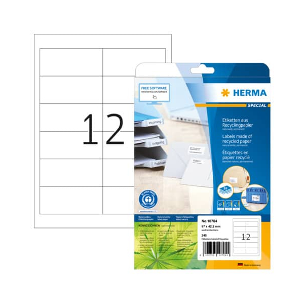 Entdecken Sie die selbstklebenden Etiketten Special 10704 von Herma, die aus naturweißem Recyclingpapier hergestellt sind. Diese hochwertigen Universaletiketten sind auf A4-Blättern angeordnet und erfreuen sich dank ihrer umweltfreundlichen Eigenschaften, wie dem Blauen Engel, großer Beliebtheit. Sie sind ideal zum Adressieren und Kennzeichnen von verschiedenen Objekten und Materialien.