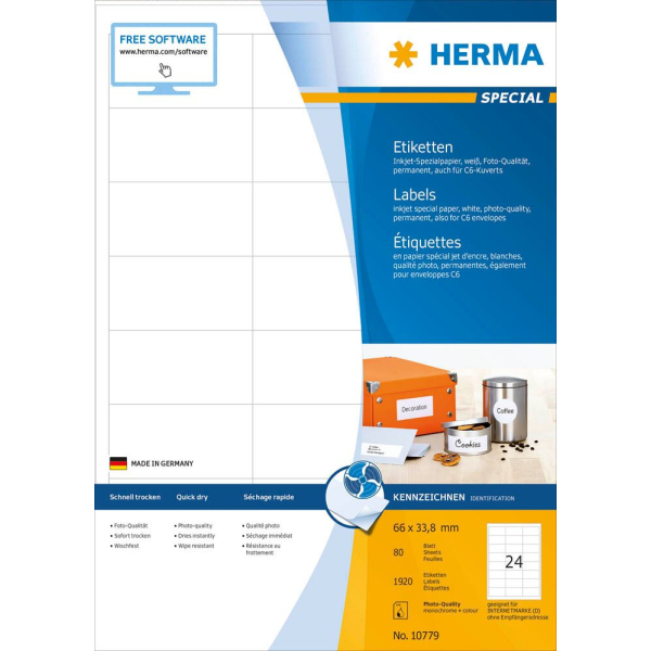 Entdecken Sie die Etiketten Special von Herma, ideal für alle Ihre Beschriftungsbedürfnisse. Diese hochwertigen, selbstklebenden Universaletiketten in der Größe 66x33,8mm sind perfekt für Inkjetdrucker geeignet und bieten Ihnen die Möglichkeit, Ihre Etiketten in Foto-Qualität zu gestalten.