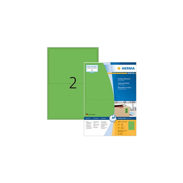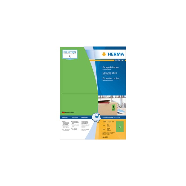 Entdecken Sie die Etiketten Special 4569 von Herma in einem auffallenden Grün! Diese hochwertigen, farbigen Etiketten sind selbstklebend und auf praktischen A4-Blättern angeordnet, sodass sie für Ihre Druckbedürfnisse ideal geeignet sind.