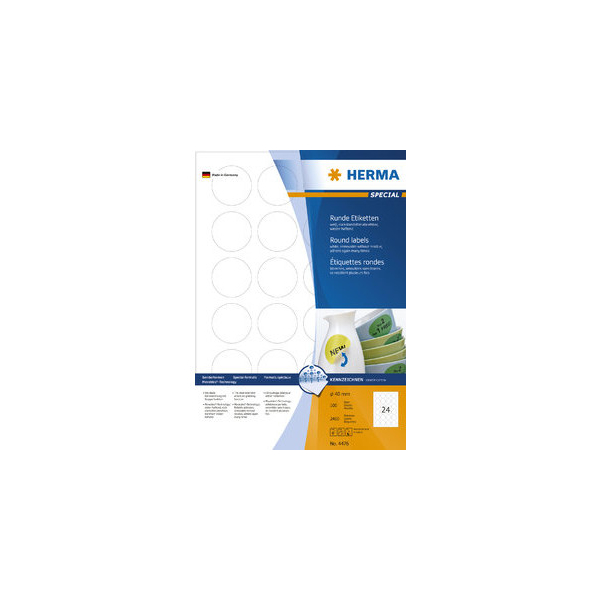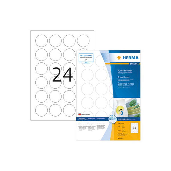Chlorfrei gebleicht, lösungsmittelfreier Haftkleber und Rundumsicherheitskante. Mit Movables®-Technologie: haftet sicher auf allen glatten, trockenen, unbeschädigten und staubfreien Flächen, rückstandsfrei wieder abziehbar, ohne den Untergrund zu beschädigen sowie problemlos repositionierbar und mehrfach wieder haftend. Alle Formate geeignet für HERMA Beschriftungssoftware Label Designer plus.