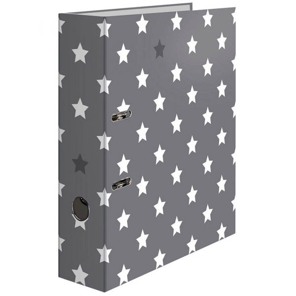Dieser Motivordner überzeugt nicht nur mit seinem ansprechenden Design in grau mit weißen Sternen, sondern auch mit seinen nützlichen Eigenschaften. Mit einer Breite von 285mm und einer Höhe von 315mm bietet er ausreichend Platz für Ihre Unterlagen im DIN A4 Format. Dank seiner starken Hebelmechanik mit Ein-Hebel-System lässt sich der Ordner mühelos öffnen und schließen.