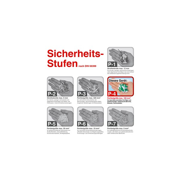 herausnehmbarer Auffangbehälter, mit Rollen, Rücklauffunktion, Start-/Stoppautomatik, Überhitzungsschutz, vernichtet Büroklammern, vernichtet CDs/DVDs, vernichtet Heftklammern, vernichtet Kreditkarten, Überlastungsschutz, Touchdisplay, Behälter voll, Sicherheitsverriegelung mit Code, Behälter geöffnet, Sichtfenster, Autofeed