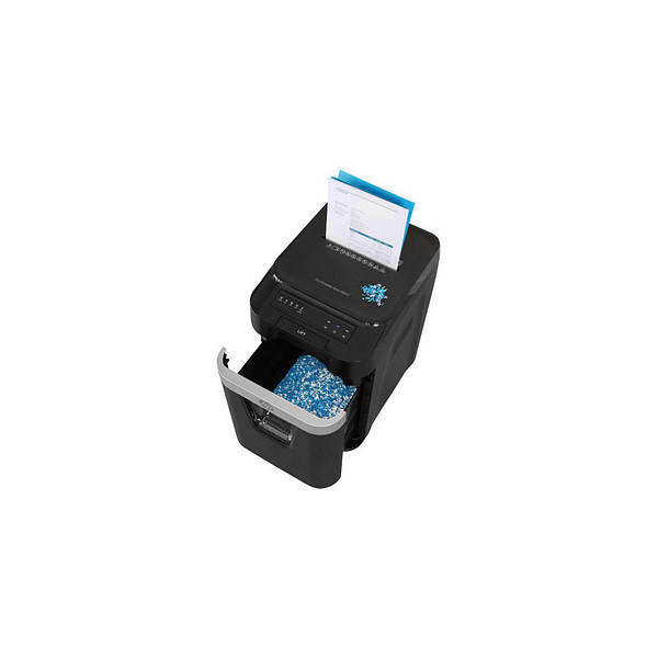 herausnehmbarer Auffangbehälter, mit Rollen, Rücklauffunktion, Start-/Stoppautomatik, Überhitzungsschutz, vernichtet Büroklammern, vernichtet Heftklammern, vernichtet Kreditkarten, Überlastungsschutz, Touchdisplay, Behälter voll, Behälter geöffnet, Sichtfenster, Autofeed