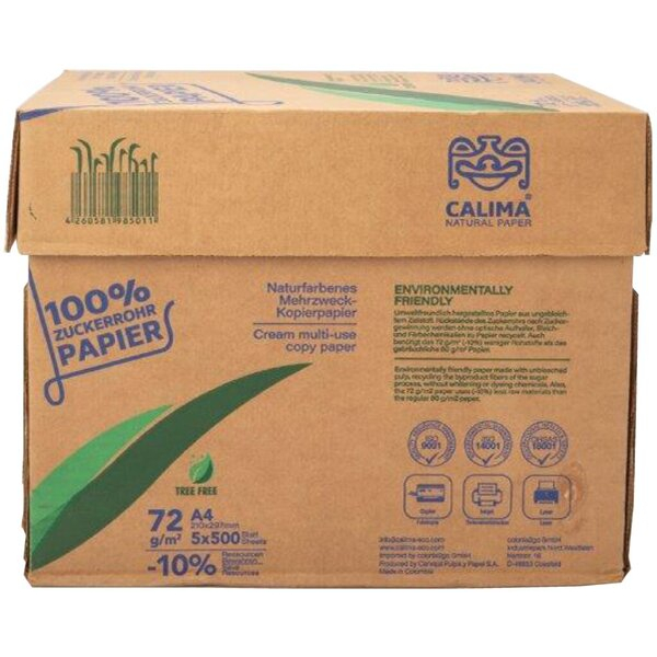 Das Calima Mehrzweck-Kopierpapier ist ein baumfreies Papier, das zu 100 % aus Zuckerrohr besteht. Es wird ausschließlich aus Fasern hergestellt, die als Nebenprodukt der Zuckerherstellung anfallen.