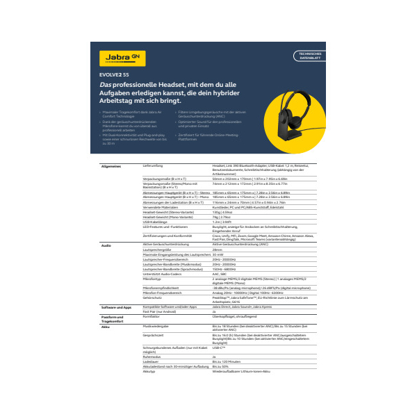 An hybriden Arbeitstagen ist viel los und Ihr Headset muss immer mithalten können. Das Evolve2 55 ist speziell für Sie und Ihre Arbeitsweise entwickelt. Damit können Sie genau so arbeiten, wie Sie möchten. Das Headset bietet professionellen Sound für Ihre Anrufe und Musikwiedergabe – mit leistungsstarker aktiver Geräuschunterdrückung (ANC), geräuschunterdrückenden Mikrofonen und speziellen 28 mm großen Lautsprechern.