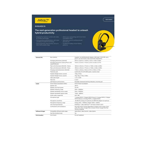Die Akkulaufzeit wurde verlängert, sodass Sie die Musik genießen können, die Sie bei der Arbeit unterstützt, ohne ständig unterbrechen zu müssen, um das Headset aufzuladen. Mit dem Evolve2 55 sind Sie auf alles vorbereitet. Die kompakten Maße von 172x74x212 mm und die elegante schwarze Farbe machen dieses Headset auch optisch zu einem Highlight.