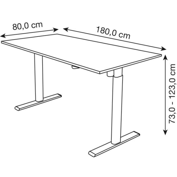 Mit einer beeindruckenden Höhenverstellbarkeit von 73-123cm können Sie den Tisch optimal an Ihre Bedürfnisse anpassen. Seine großzügigen Maße von 180x80cm (BxT) bieten ausreichend Platz für Computer, Unterlagen und andere Büroartikel.