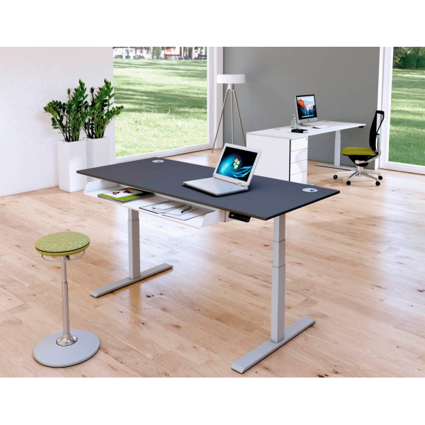 Der Schreibtisch Move 2 Plus ist nicht nur praktisch, sondern auch optisch ansprechend in der Farbe anthrazit und einem silbernen Gestell. Mit einem stabilen T-Fuß-Gestell aus Stahl steht er fest auf dem Boden und trägt eine maximale Belastung von bis zu 80 kg.