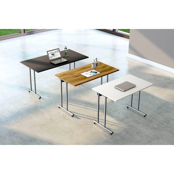 Der Schreibtisch ist aus robustem Spanplatte gefertigt und verfügt über eine Melaminharzbeschichtung, die für Langlebigkeit und einfache Pflege sorgt. Die C-Fuß-Gestell Konstruktion aus Stahl gibt dem Schreibtisch zusätzliche Stabilität.