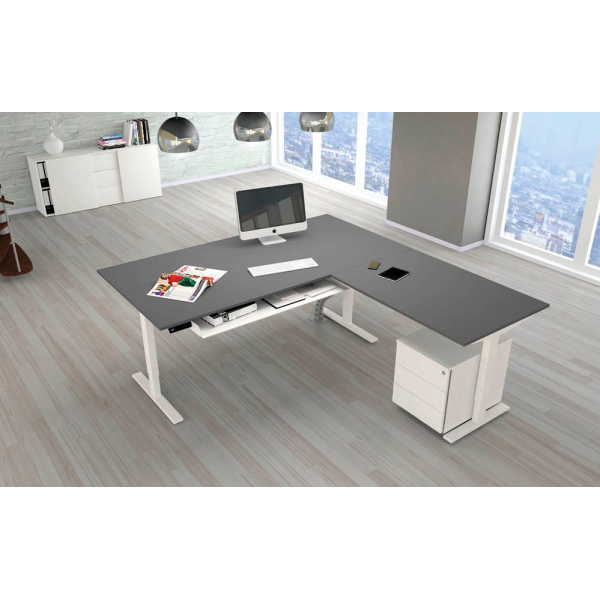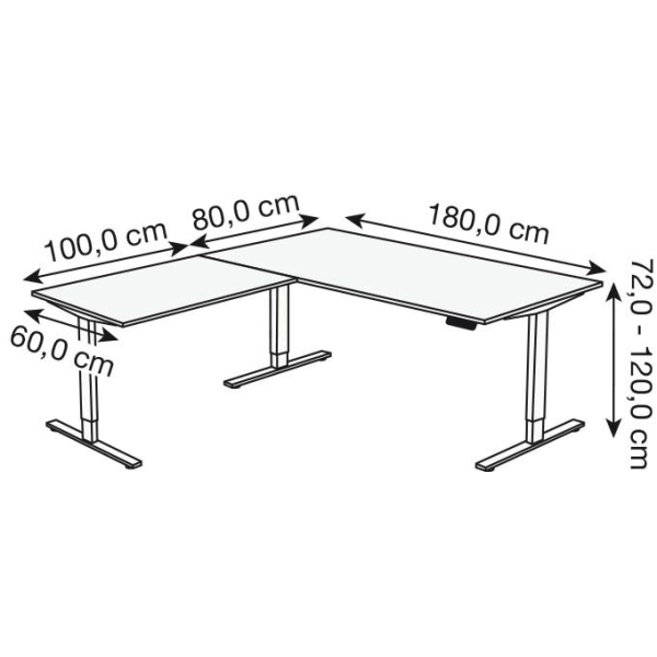 Mit einer Höhenverstellung von 72-120 cm und einer großzügigen Tischplatte von 180x80 cm in L-Form, ist der Schreibtisch sowohl für kleine als auch für große Arbeitsplätze geeignet. Die Kombination aus graphitfarbener Tischplatte und einem eleganten weißen Gestell verleiht Ihrem Büro einen modernen Look.